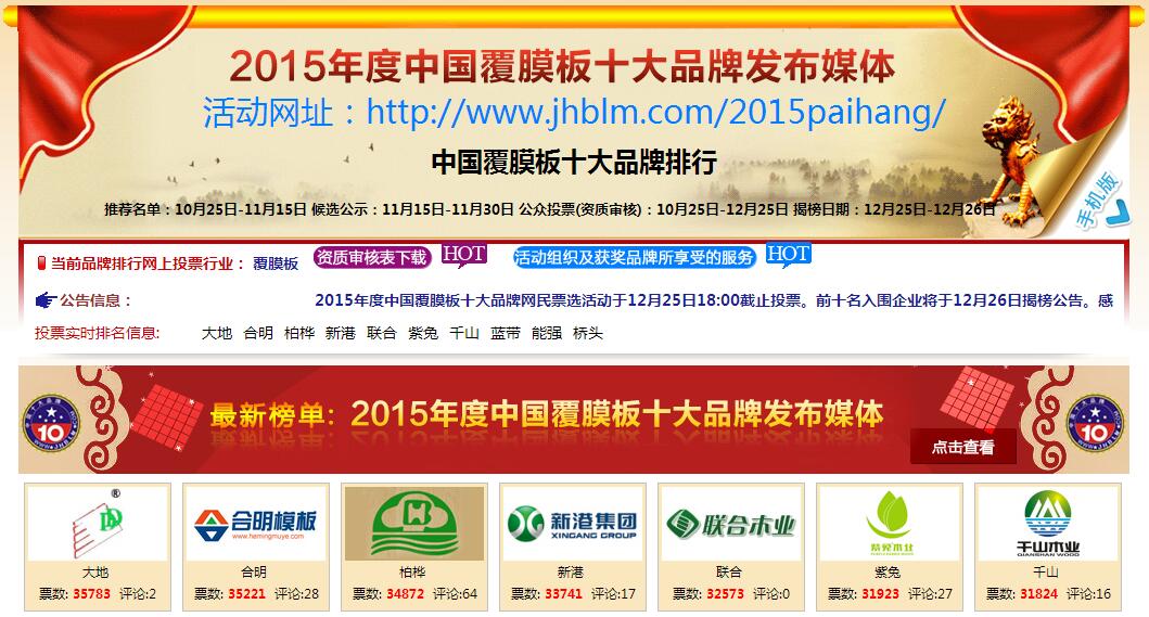 熱烈祝賀合明木業(yè)榮獲2015年度“中國覆膜板十大品牌”第二名。據(jù)悉,此次評選經(jīng)過篩選國內(nèi)具有代表性的覆膜板品牌上榜,再經(jīng)過一個月網(wǎng)絡投票,最終按照票數(shù)從高到低排列,前十名者入選。