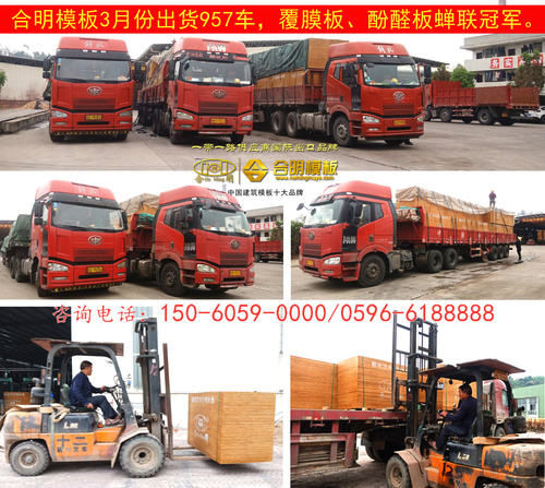 3月份,合明模板出貨量大大增加,創(chuàng)歷史新高:建筑模板發(fā)貨957車,建筑木方發(fā)貨303車,出口建筑模板102個(gè)貨柜,總計(jì)1362車,比去年3月份增長45%。