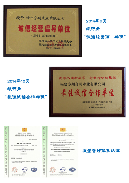 合明木業(yè)憑借十幾年的發(fā)展位列“中國建筑模板十大品牌”,其自主品牌--合明牌建筑模板在業(yè)內(nèi)廣受好評。2014年,合明木業(yè)及合明牌建筑模板系列產(chǎn)品,以其高質(zhì)量的產(chǎn)品和高標準的企業(yè)精神,再次被社會各界給予高度評價。
